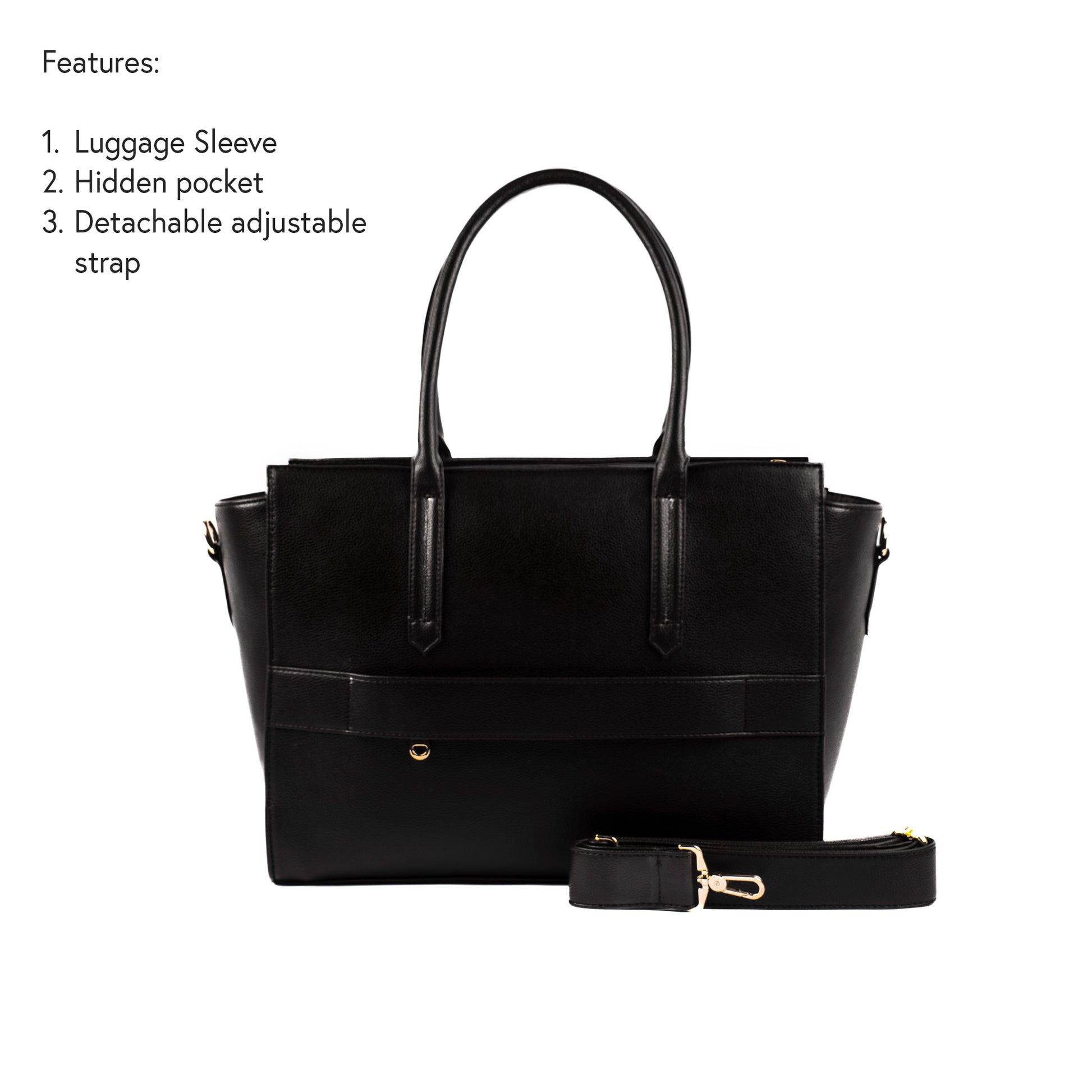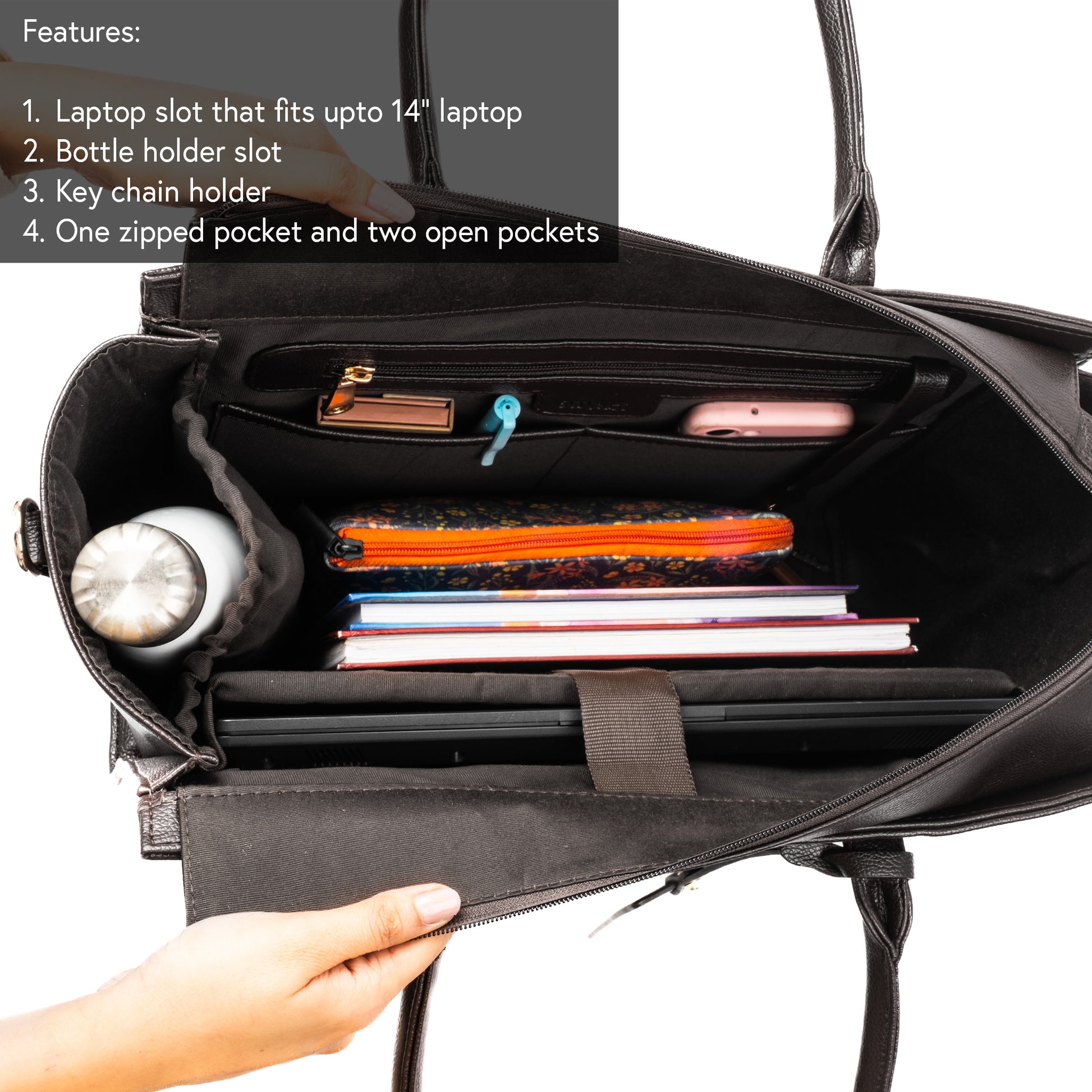 The Charcoal Chic Valeria Tote blends understated sophistication with smart functionality, offering thoughtfully designed space for all your essentials and more. Thoughtful details such as a laptop compartment, bottle holder, keychain holder, luggage sleeve, and detachable strap make it the perfect companion for work, daily errands, or a day out. This tote combines effortless style with practical elegance.